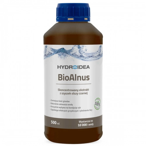 Opis produktu - new Hydroidea BioAlnus to gotowy preparat w płynie do zakwaszania wody. Produkt ten jest w 100% ekologicznym ekstraktem z szyszek olszy czarnej, który skutecznie reguluje warunki środowiskowe w stawach, oczkach i akwariach. BioAlnus hamuje rozwój glonów, zapobiega infekcjom grzybiczym, zarówno w naturalnych, jak i sztucznych zbiornikach.